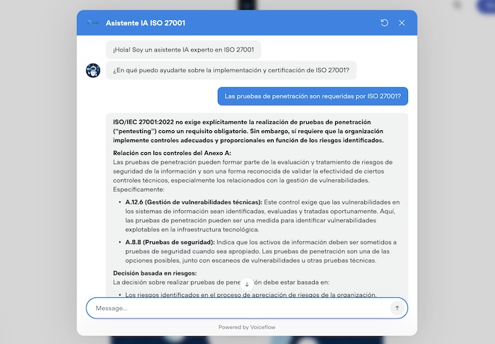 El asistente (chatbot) ofrece respuestas concretas y accionables, adaptadas a las necesidades específicas de tu empresa, con ejemplos prácticos que facilitan la implementación y el cumplimiento de la norma.