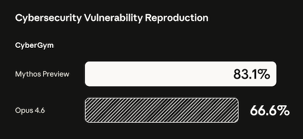 En el benchmark de referencia CyberGym, Mythos Preview alcanza un 83.1% de reproducción de vulnerabilidades, frente al 66.6% de Claude Opus 4.6 —el modelo más avanzado disponible hasta ahora.